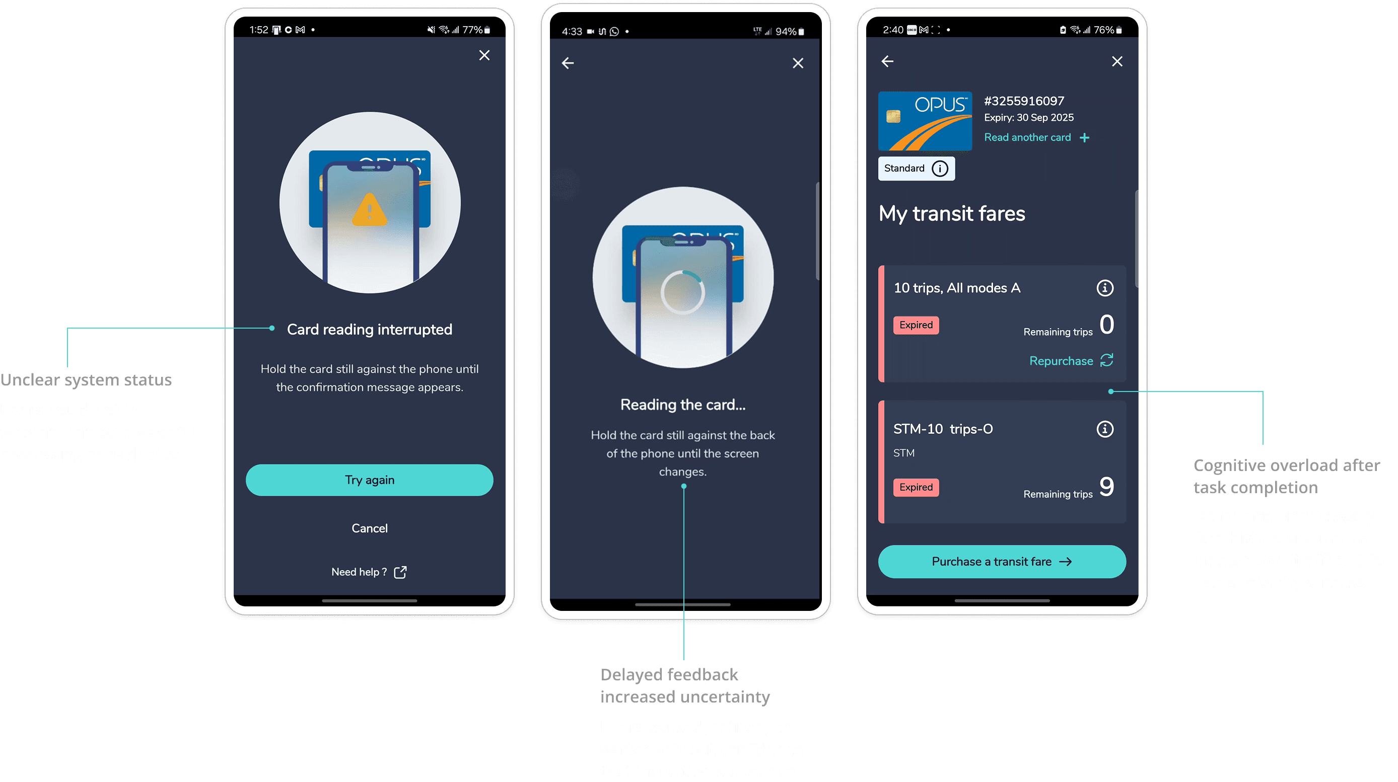 These tasks were selected because failure at any point creates immediate friction during time-sensitive transit decisions.