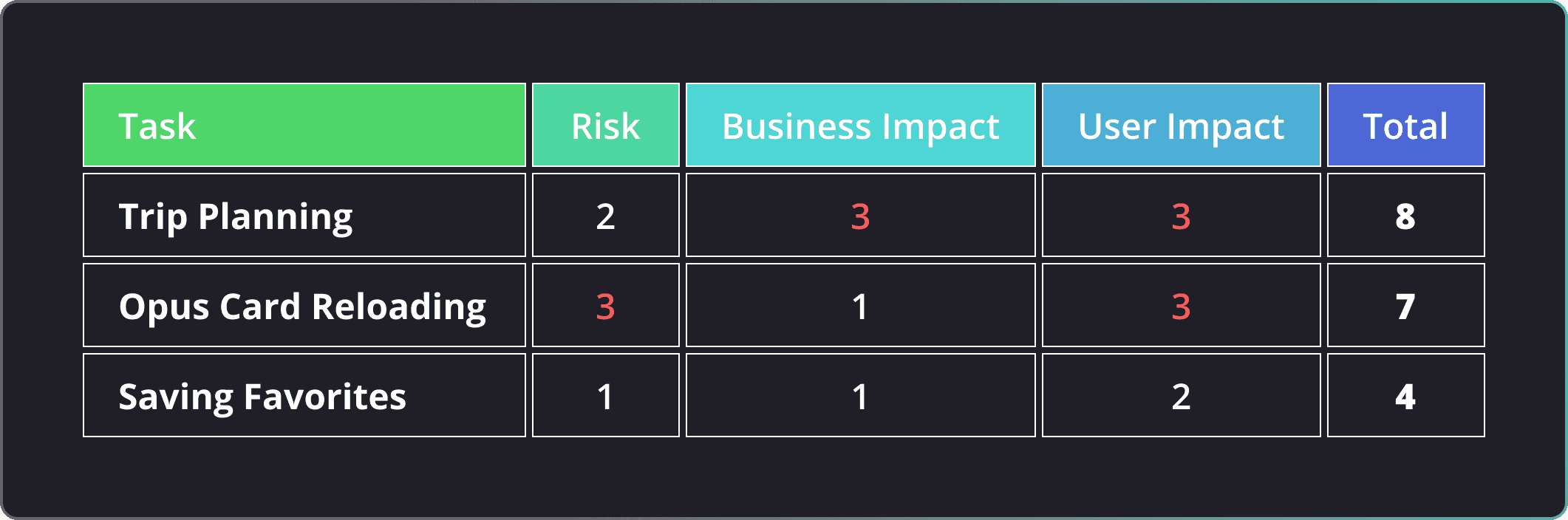 Tasks with the highest combined impact scores were selected for usability testing, ensuring the study focused on issues most likely to affect both user experience and product outcomes.