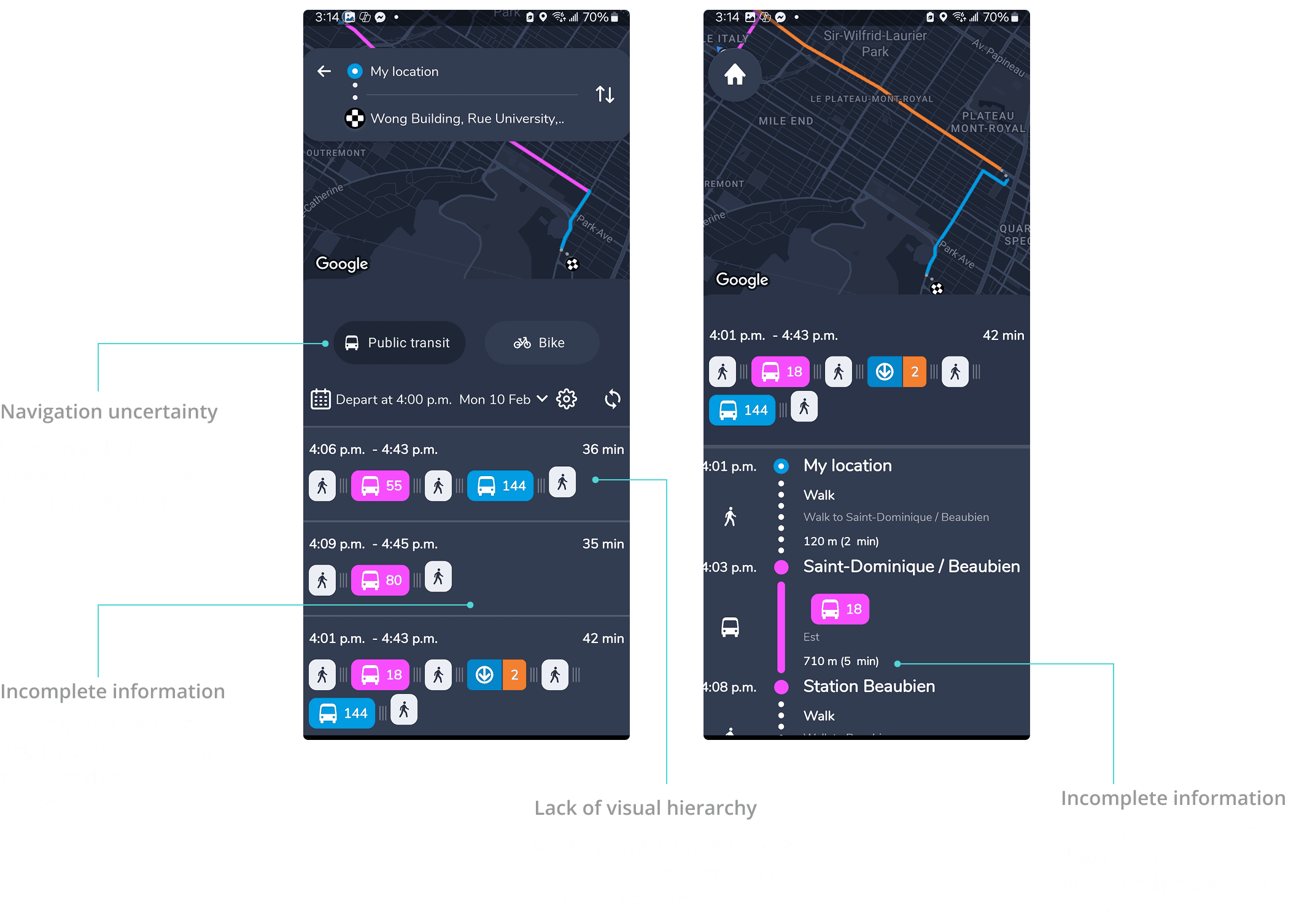 Users struggled to compare routes due to missing or delayed information (e.g., walking time, number of stops), increasing cognitive load and hesitation.